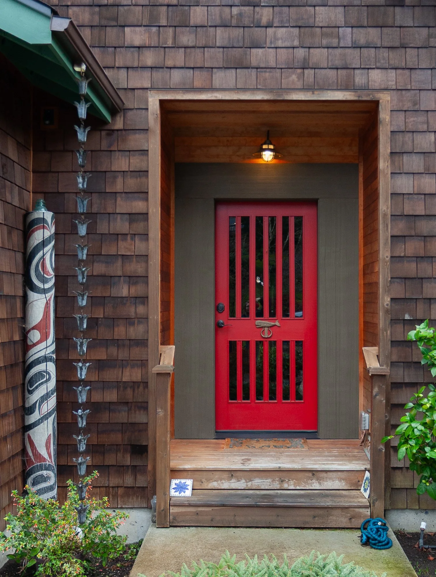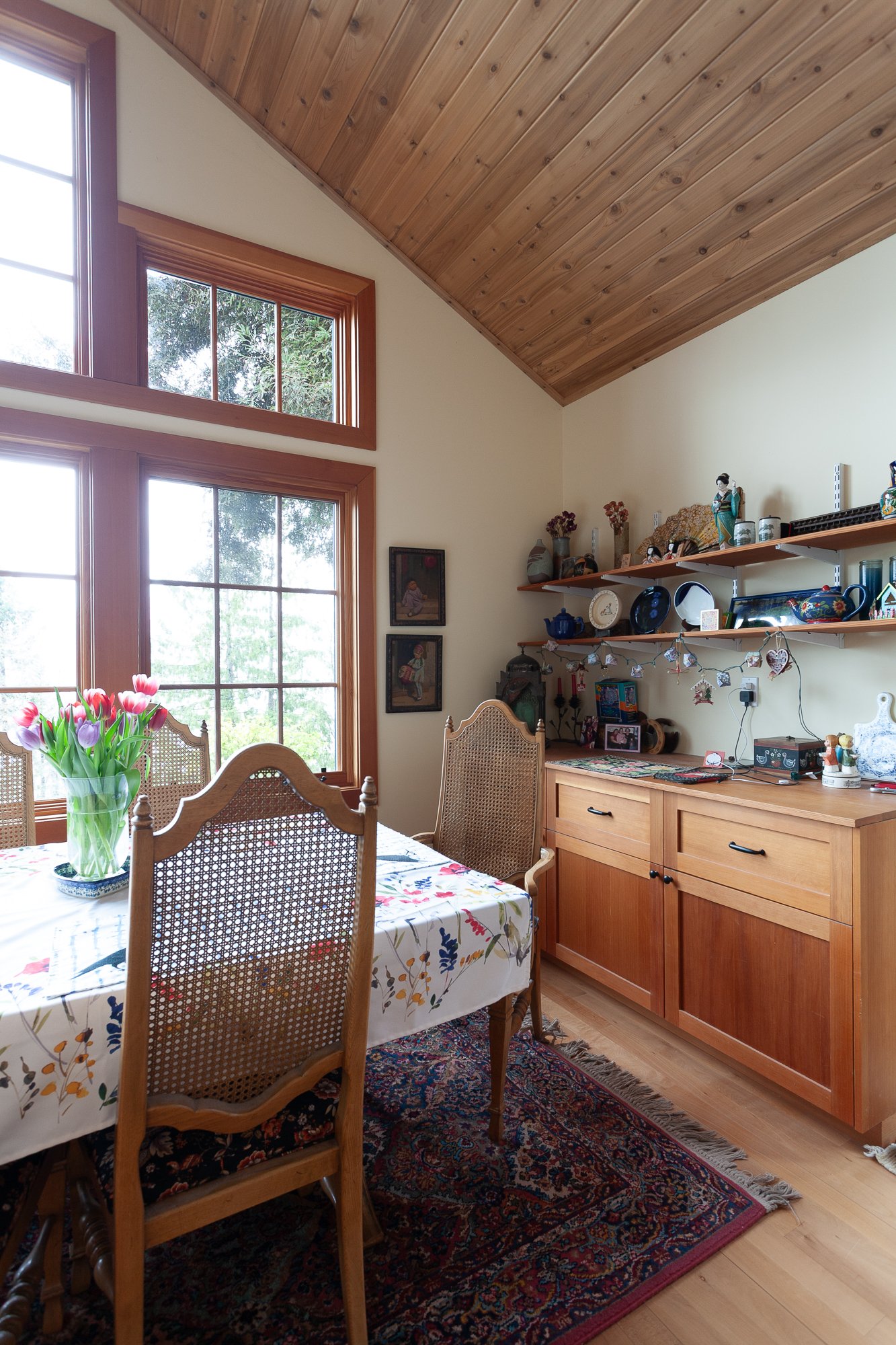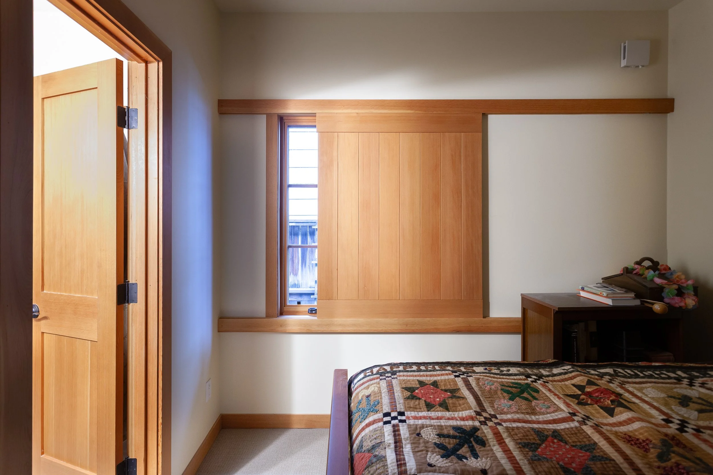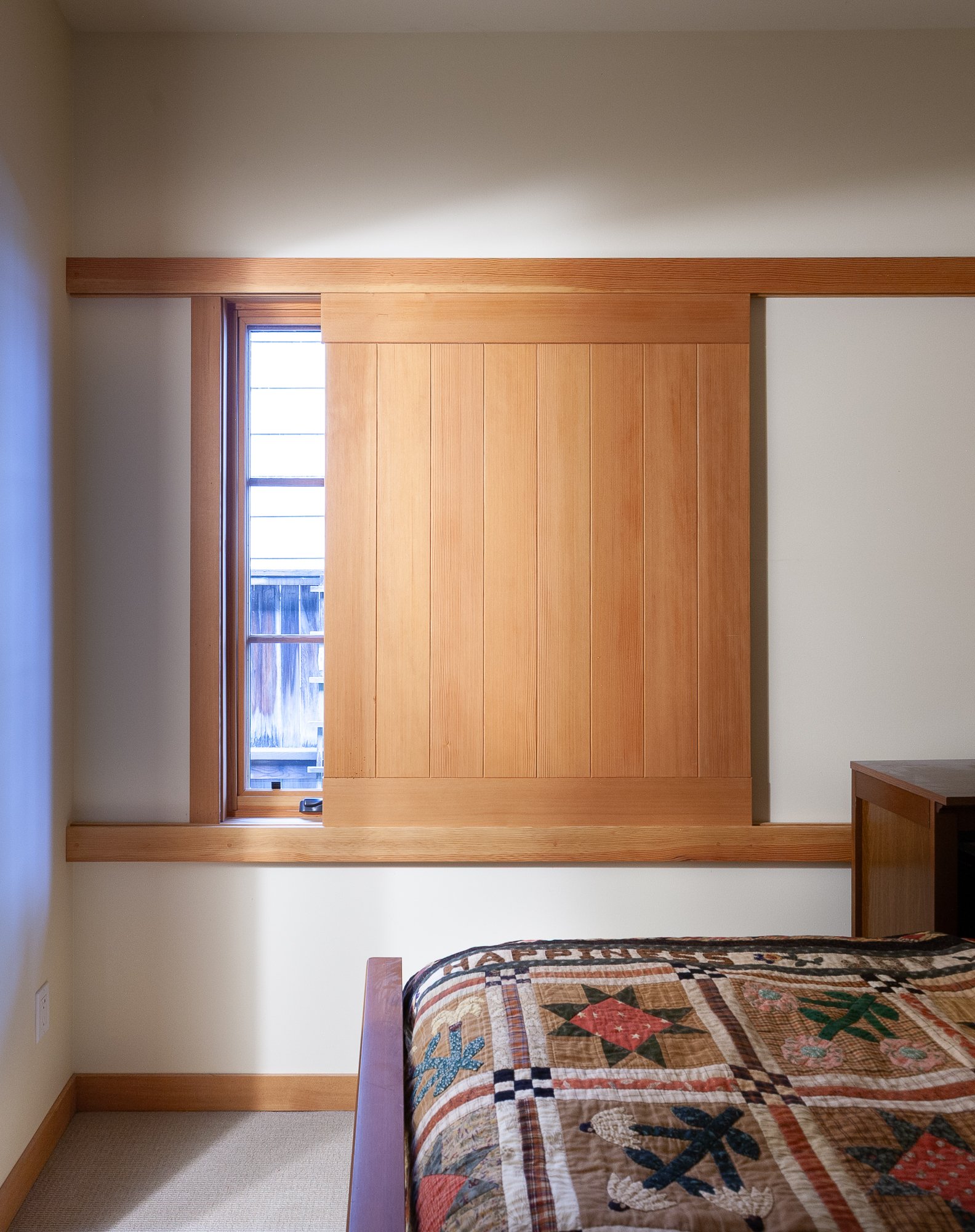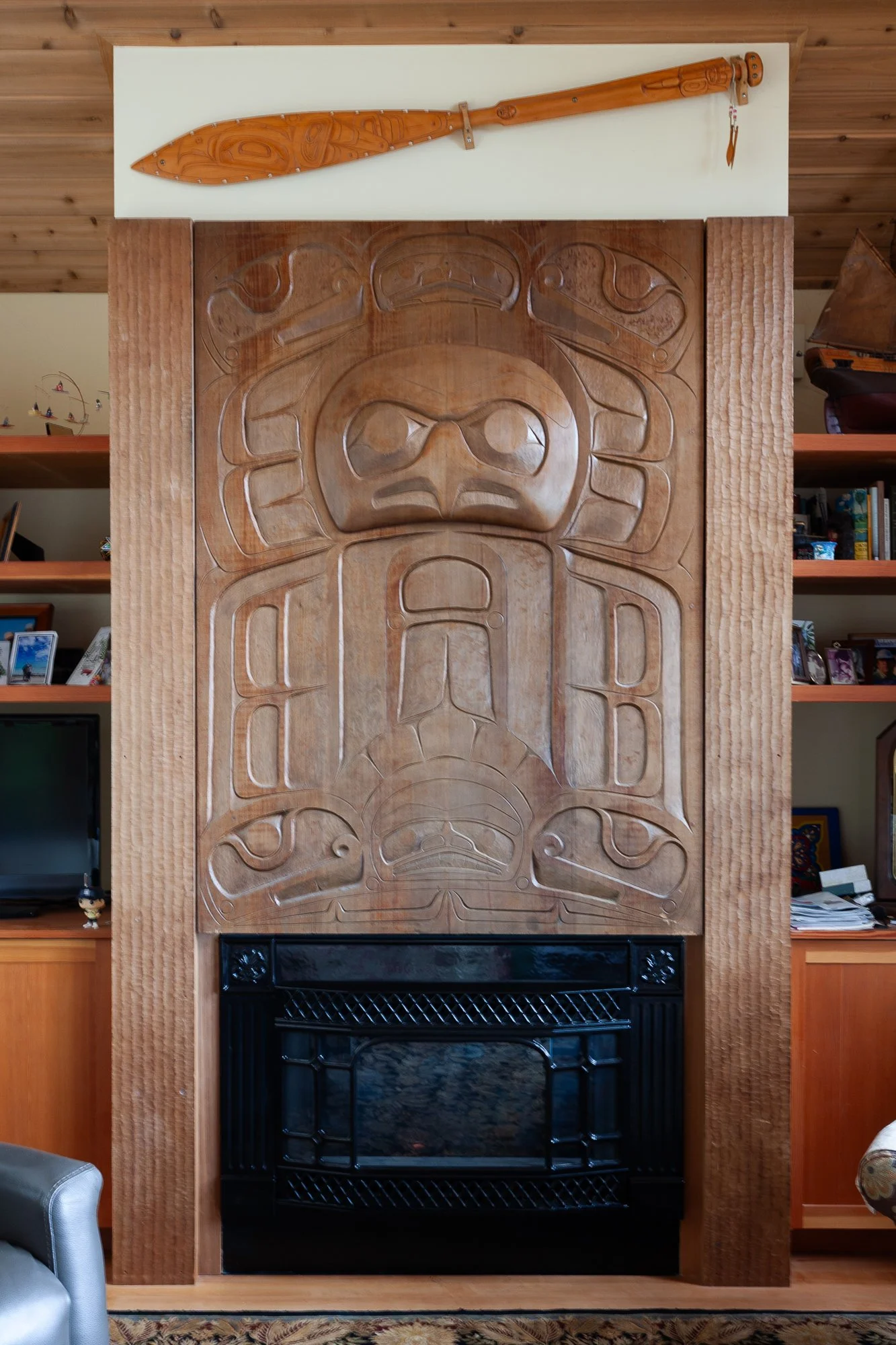 His grandmother loved her previous home, but the land on which it sat was returning to the Suquamish tribe. Certain sentimental items from her previous home were salvaged and incorporated into her new home, including the front door, wood fireplace carving insert, and a sliding fir blackout shutter/shade.