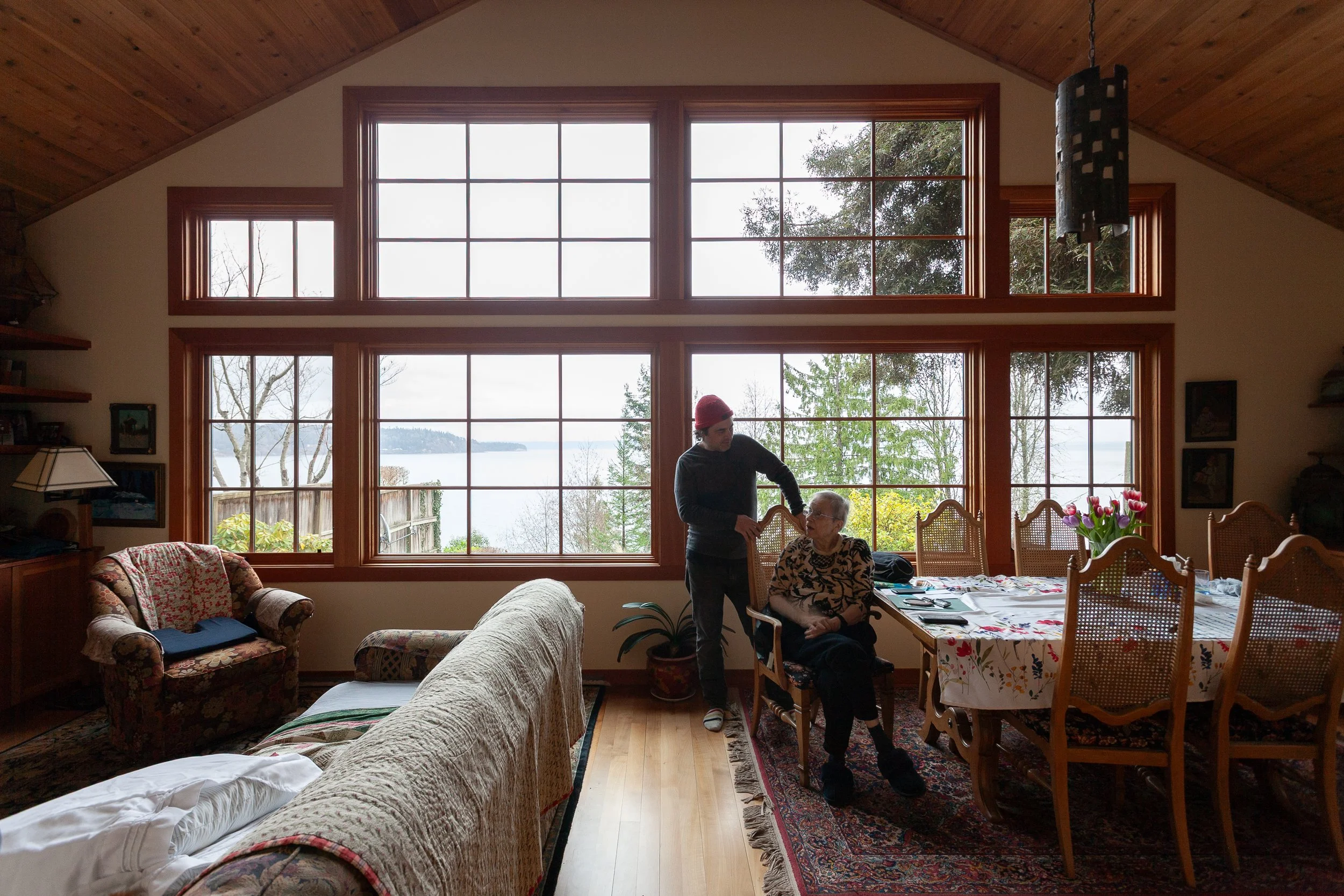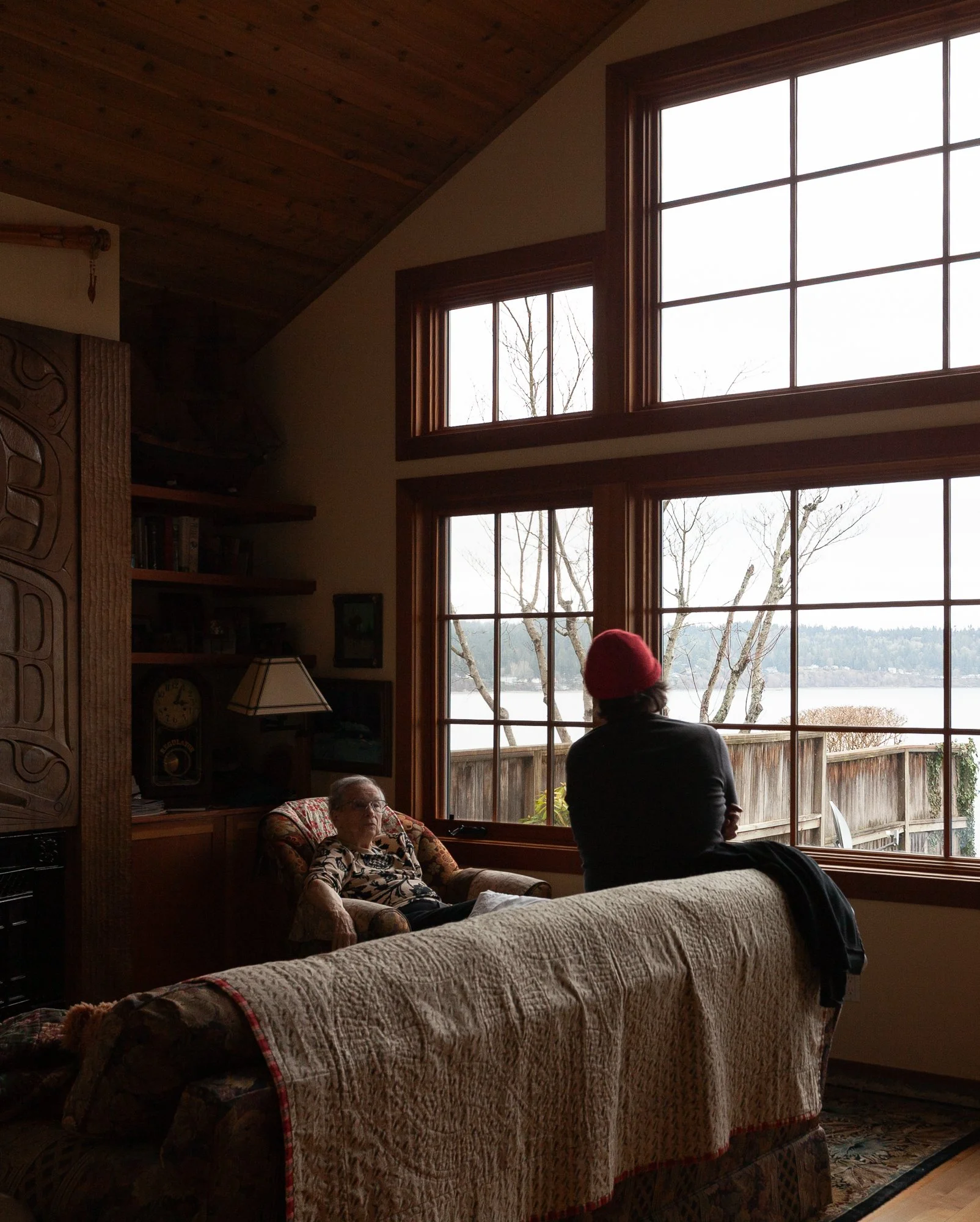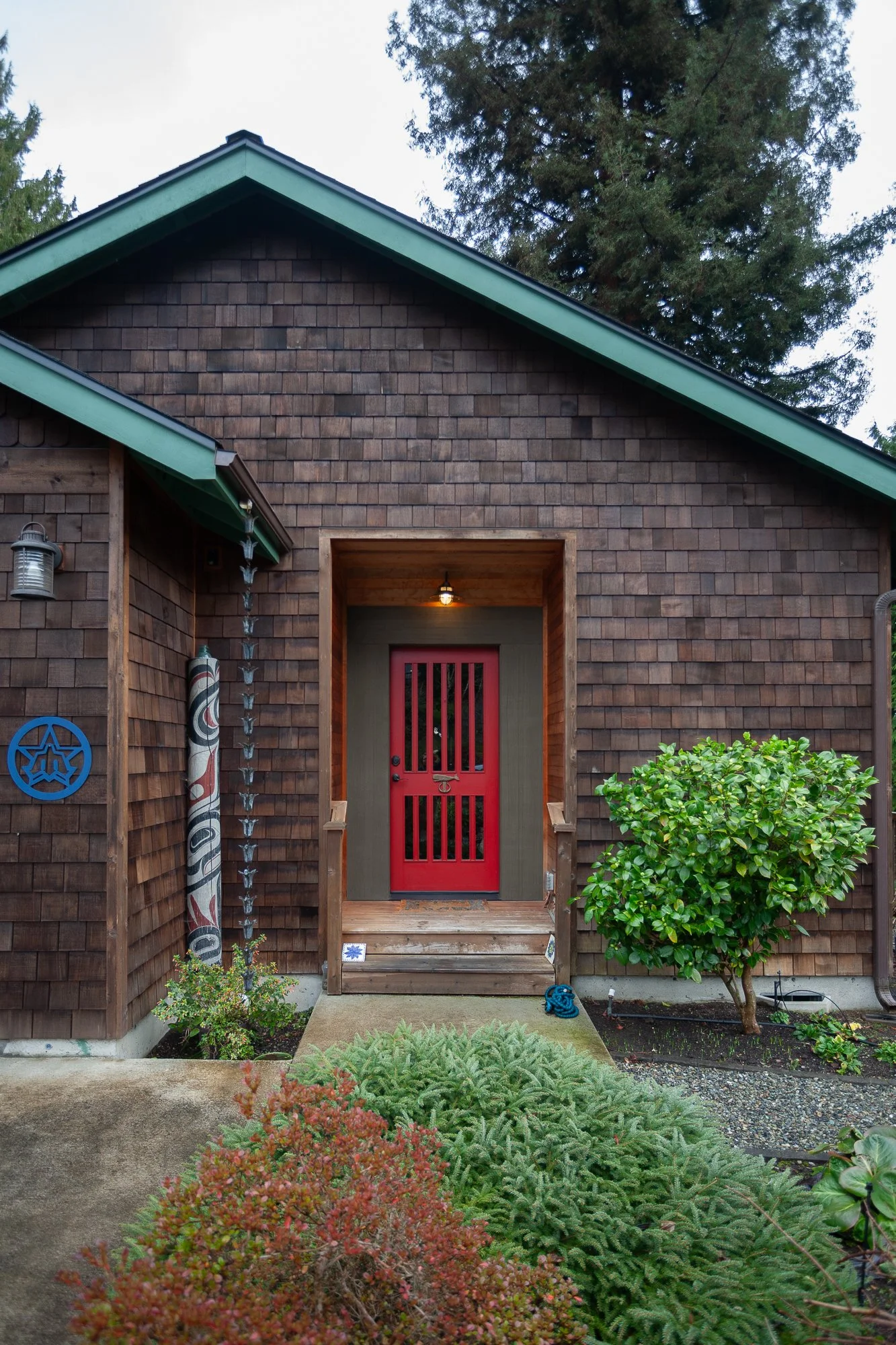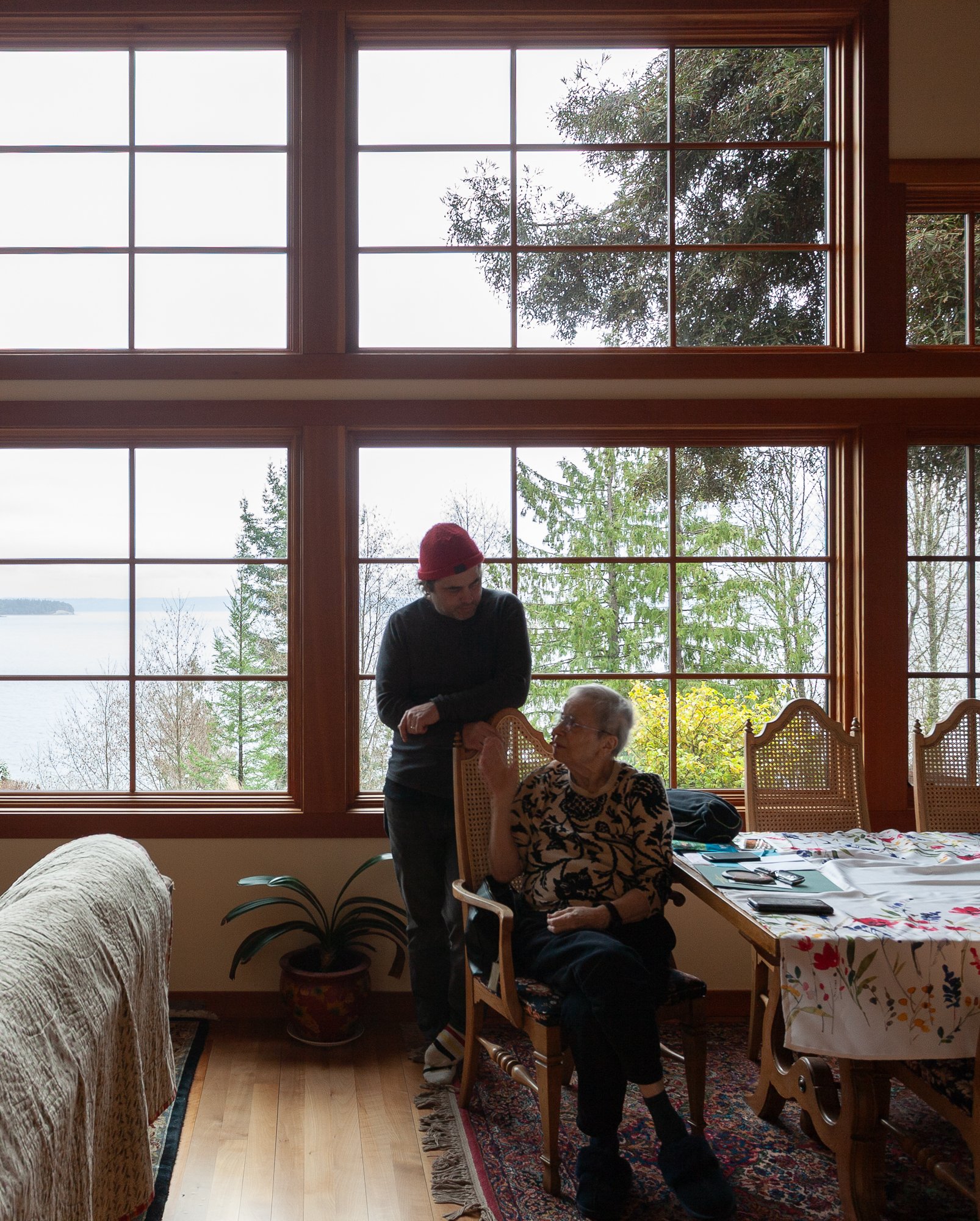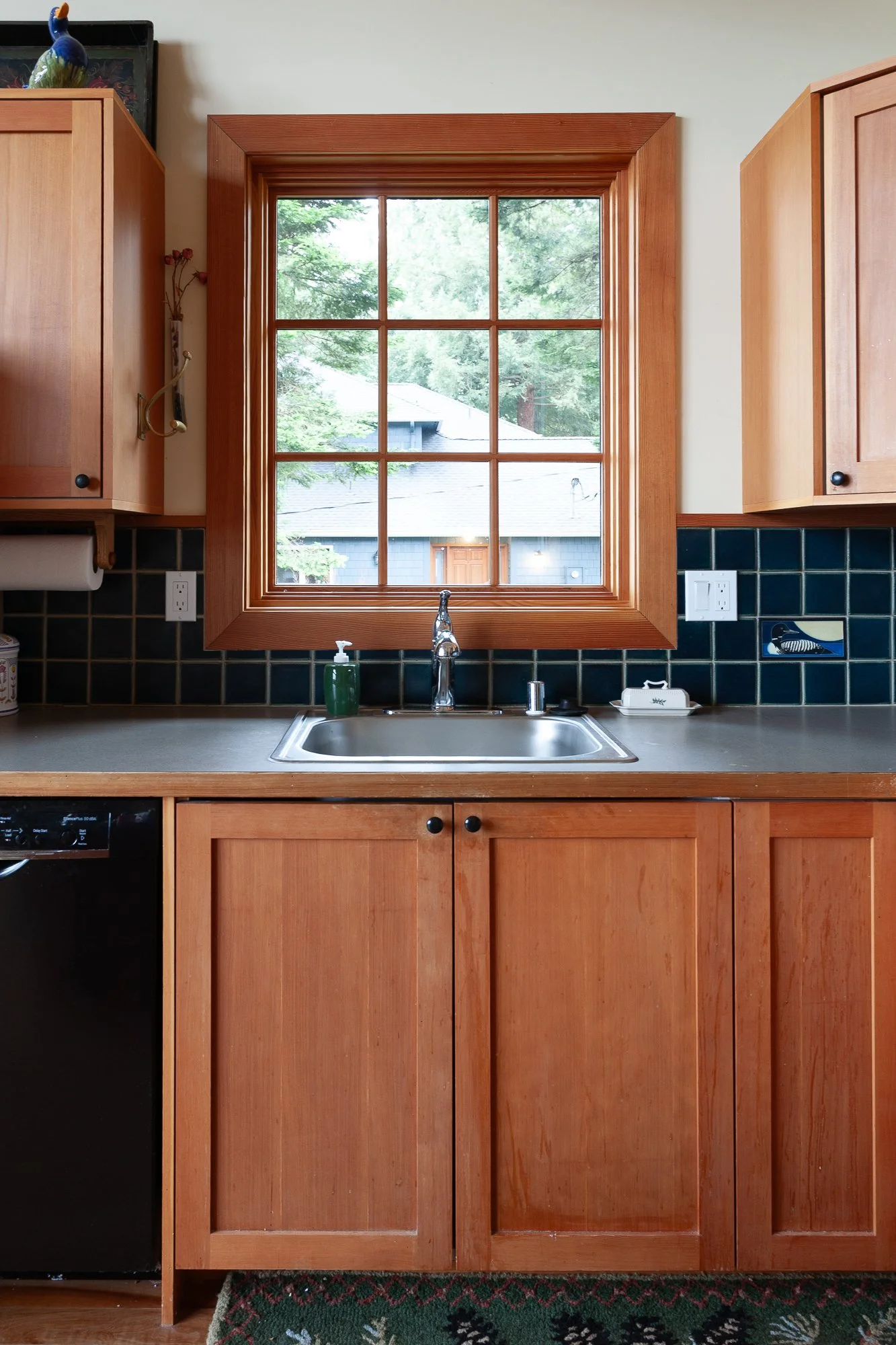 His grandmother loved her previous home, but the land on which it sat was returning to the Suquamish tribe. Certain sentimental items from her previous home were salvaged and incorporated into her new home, including the front door, wood fireplace carving insert, and a sliding fir blackout shutter/shade.